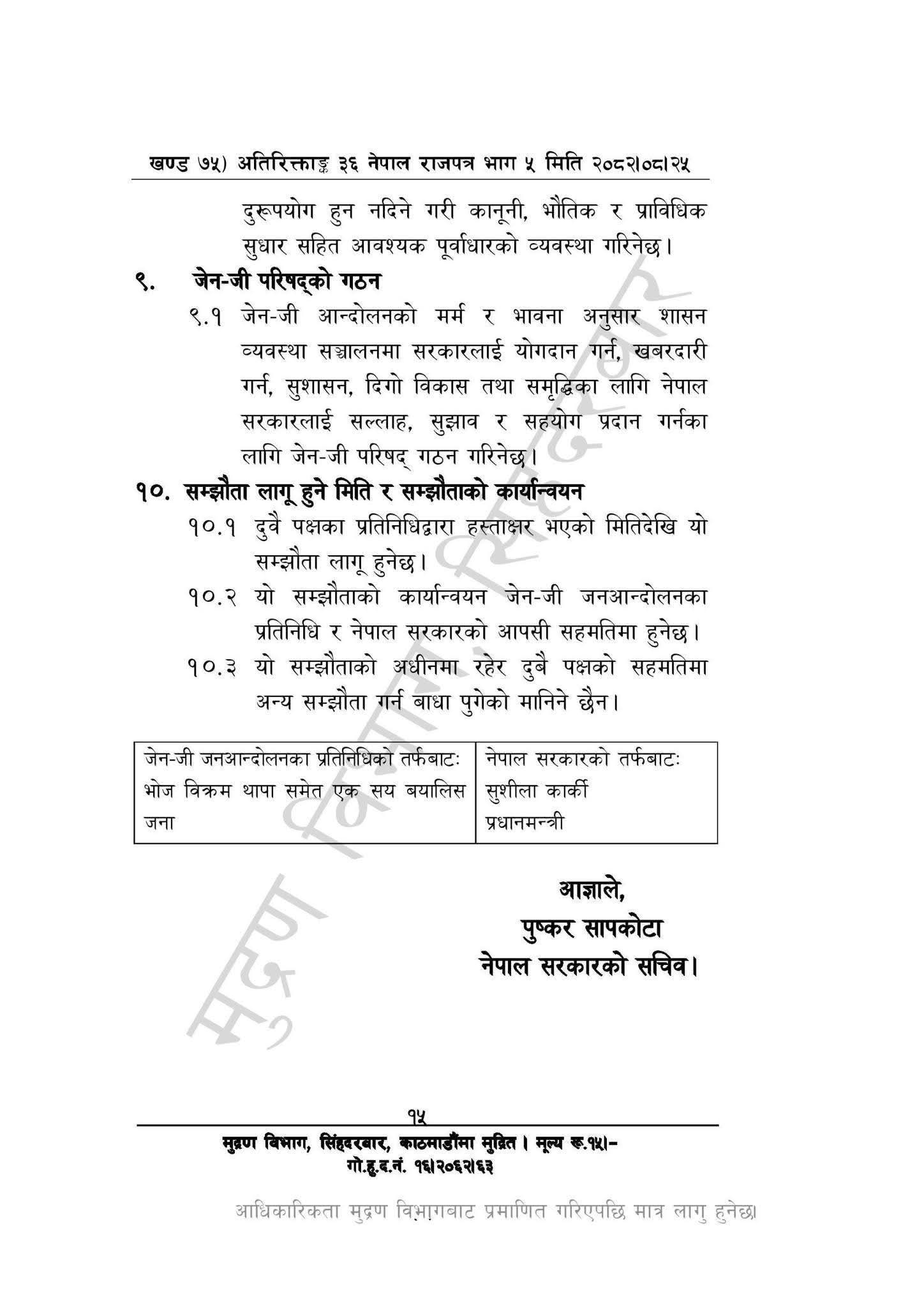 In the presence of representatives of the Gen-Z Movement and leaders of civil society, the Right Honourable Prime Minister has already signed the agreement. Subsequently, the Cabinet meeting held on Thursday approved the agreement and decided to publish it in the Gazette. Along with this, it has also been decided to extend the mandate of the investigation committee formed to look into the incidents of Bhadra 23 and 24, as required.